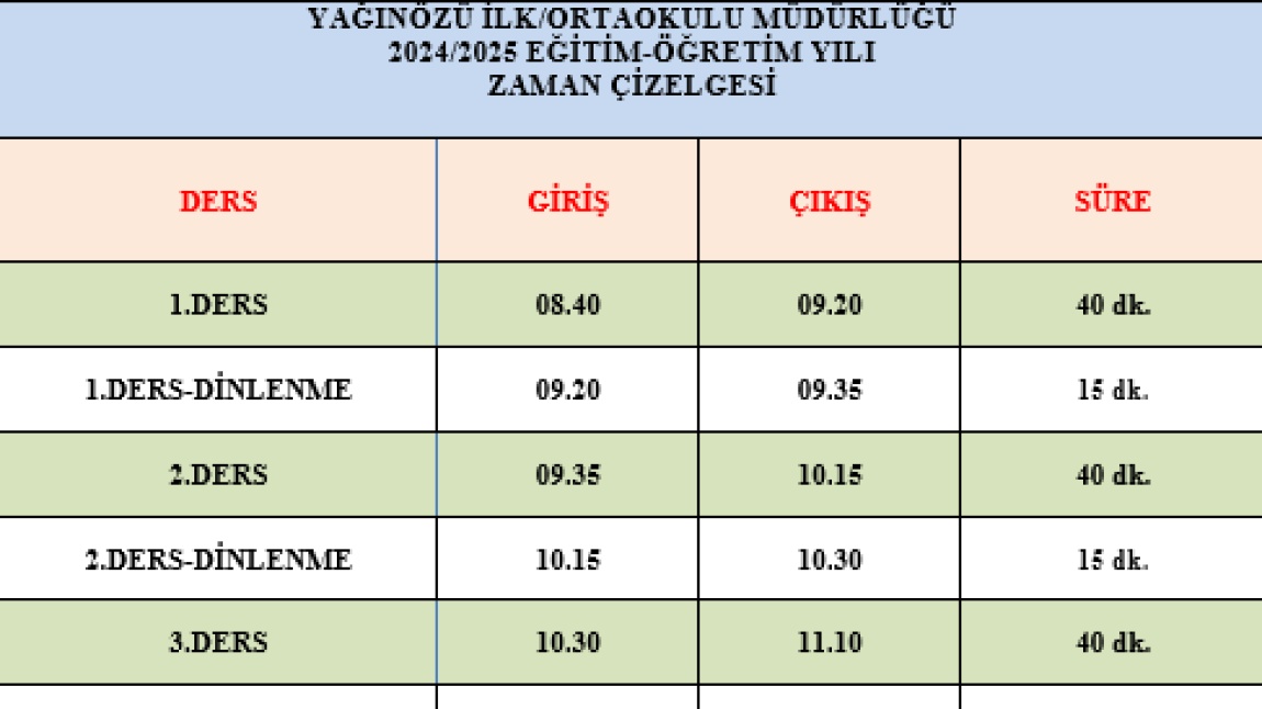 YAĞINÖZÜ İLK/ORTAOKULU MÜDÜRLÜĞÜ 2024/2025 EĞİTİM-ÖĞRETİM YILI ZAMAN ÇİZELGESİ |